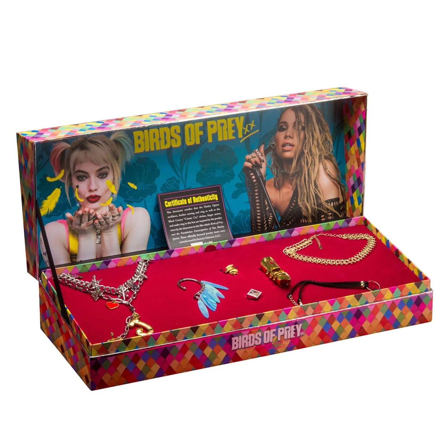 Be like Harley Quinn and Black Canary – or at least look like them – with this jewellery Power Pack that contains replicas of Harley’s J necklace, turquoise feather ear cuff, and diamond-shaped ring as well as