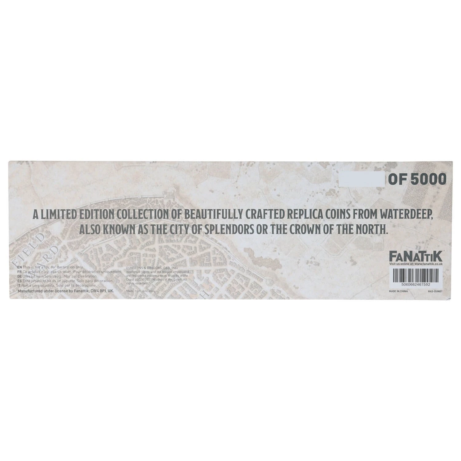 A premium set of replica coinage from Waterdeep, heavily detailed and diplayed in a case, this set is limited to only 5,000, each presentation case is invididually numbered.