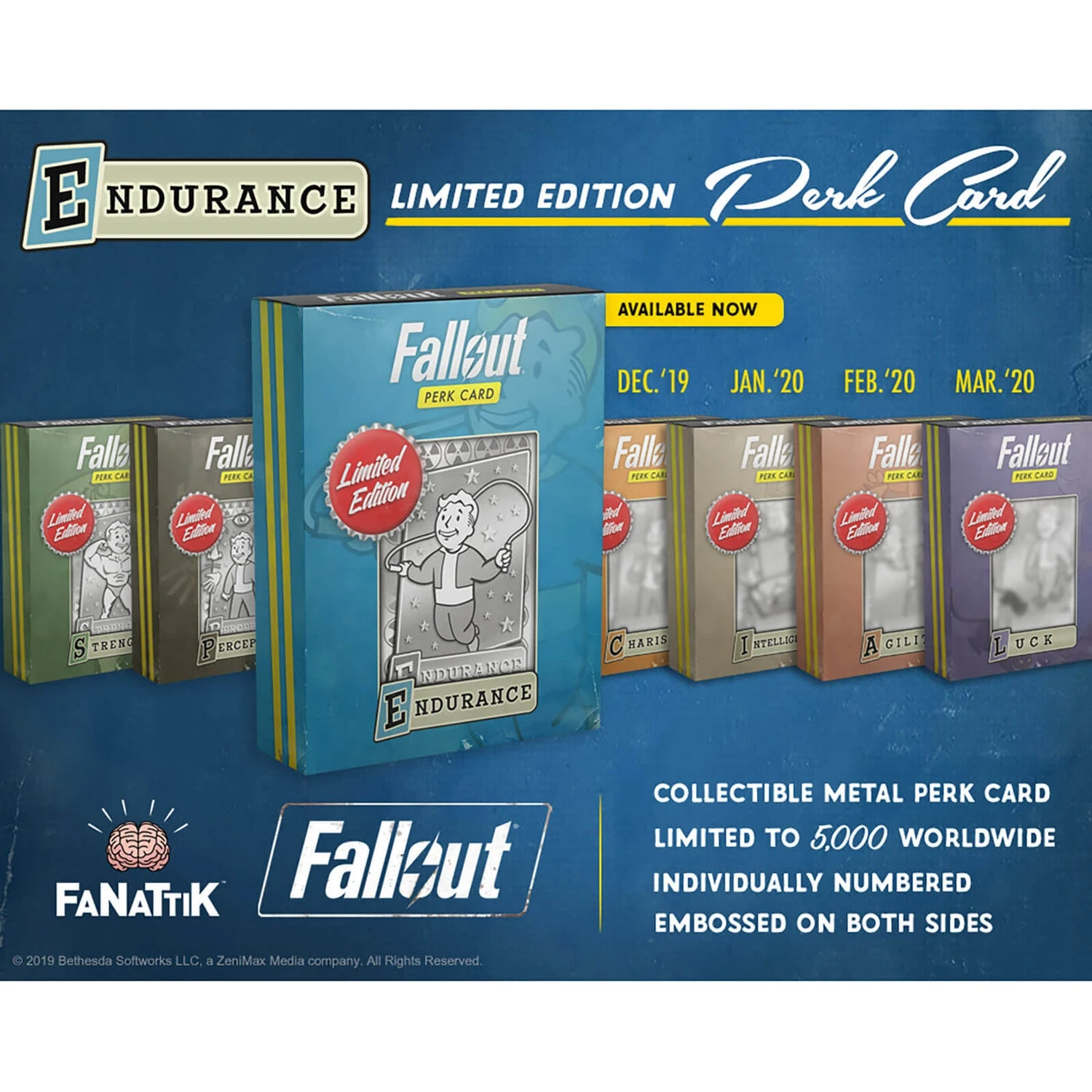 Own your very own replica perk card, this metal heavyweight card is highly detailed, embossed on both sides with a post-apocalyptic distressed finish. Limited to only 5,000 worldwide, each card is individually numbered. Venture out of your bunker and grab your very own Fallout collectible.