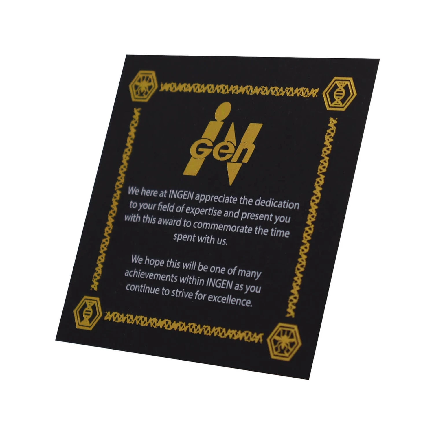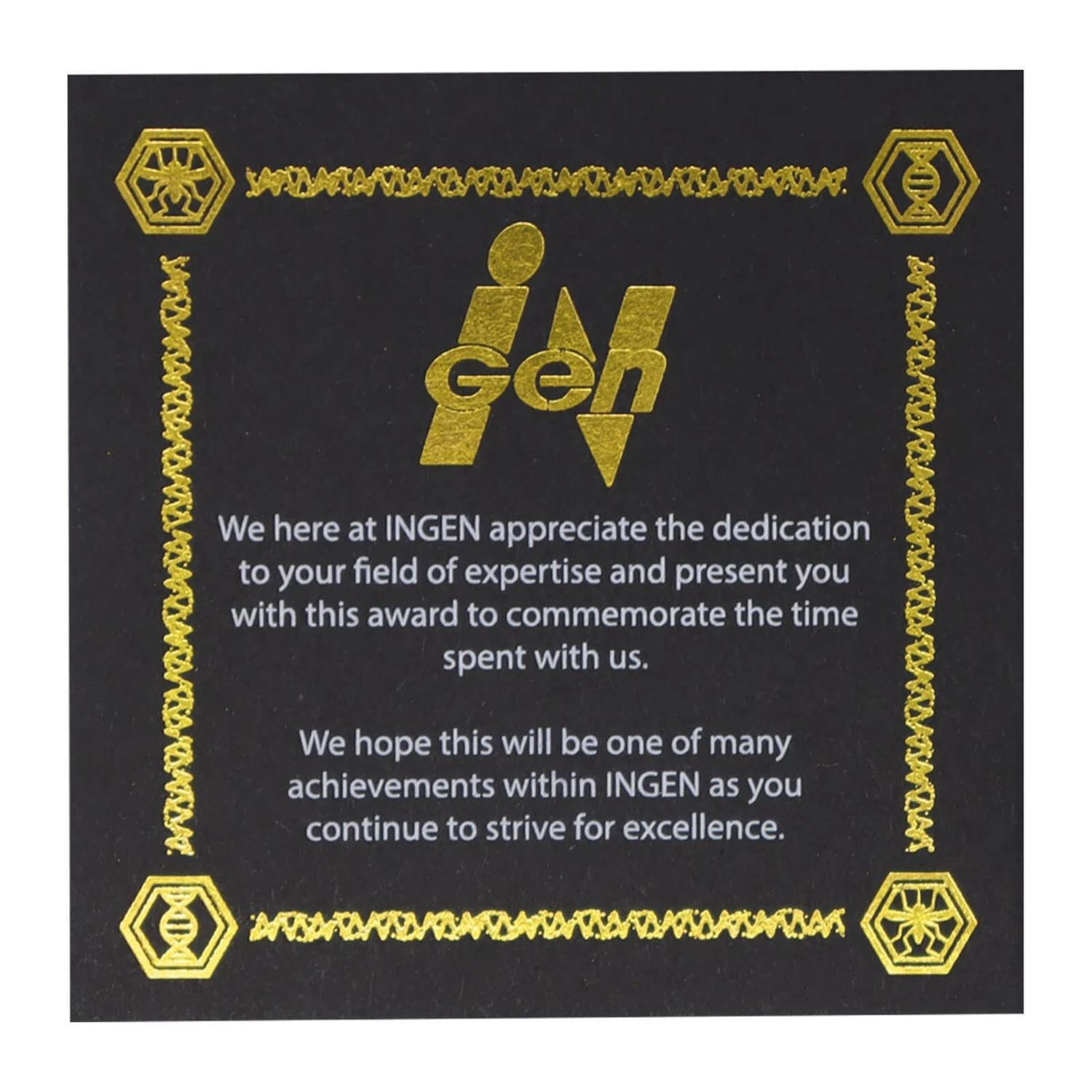 An in-world service award from the Genetics Division of INGEN. You survied 10 years! Includes a 24k gold plated INGEN coin, 24k gold plated pin badge and 24k gold plated 10 year service medal. Also supplied with a note from INGEN.