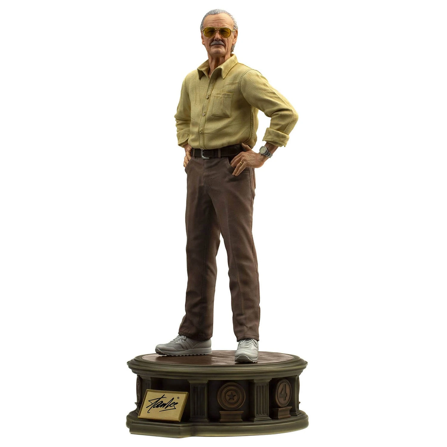 - A figure in the impressive 1/4 scale, on a luxurious base with adornments around it, reminiscent of several of his most famous creations and a front plate with his unmistakable signature, which accompanied us in the comics. The statue also has two pairs of arms and two interchangeable heads for different presentation poses, with the option of his arms extended or around his waist, as he would say, “Stan Lee presents:”!