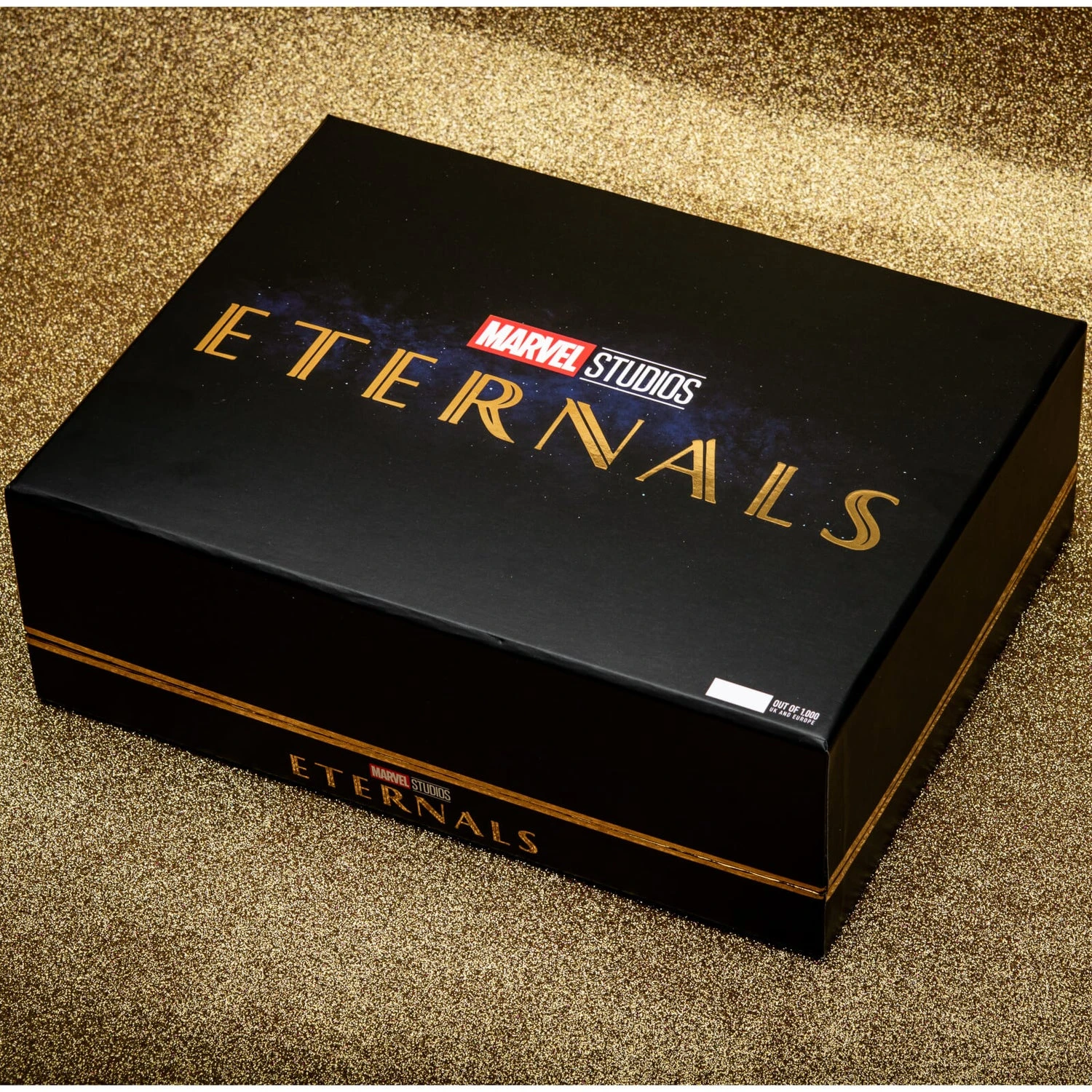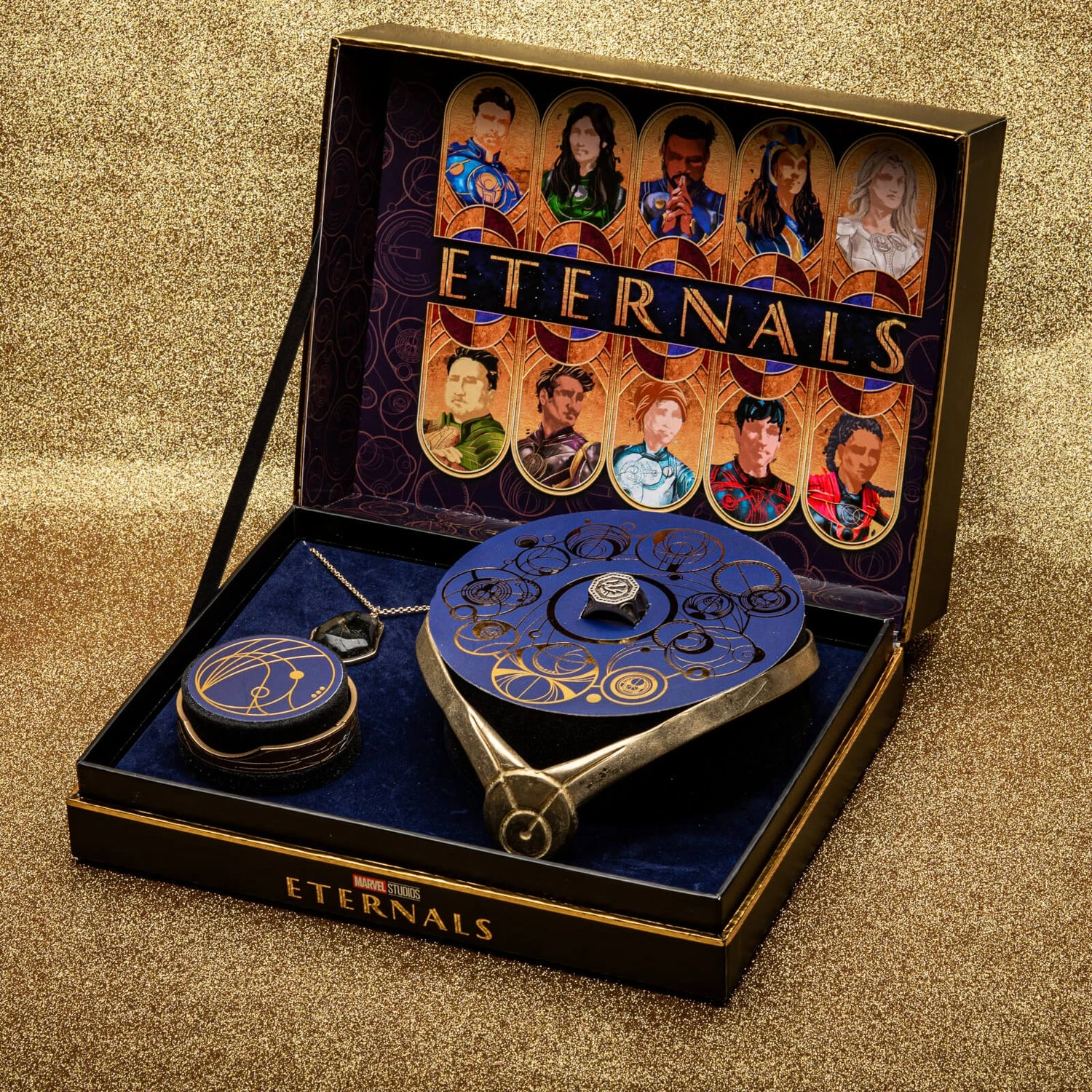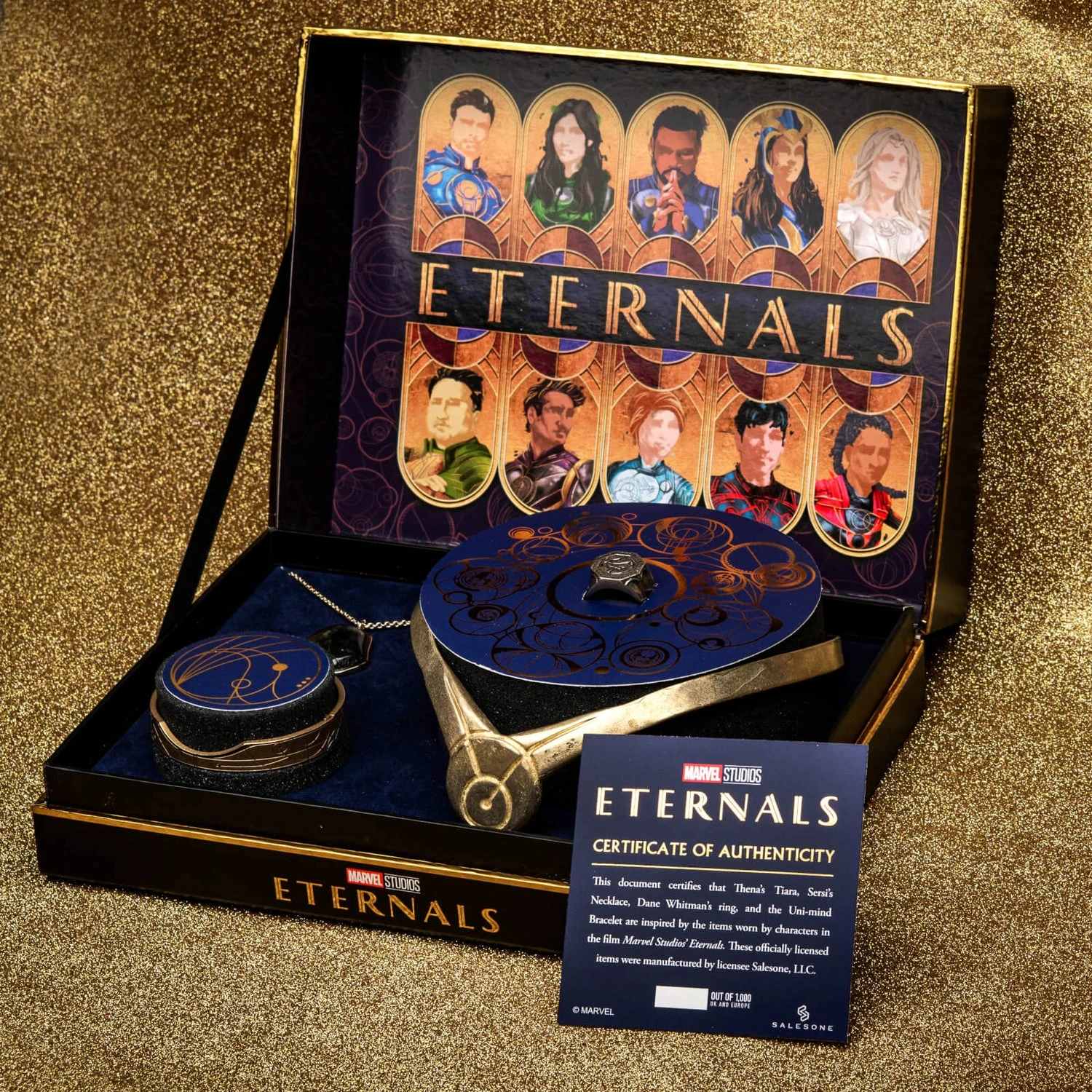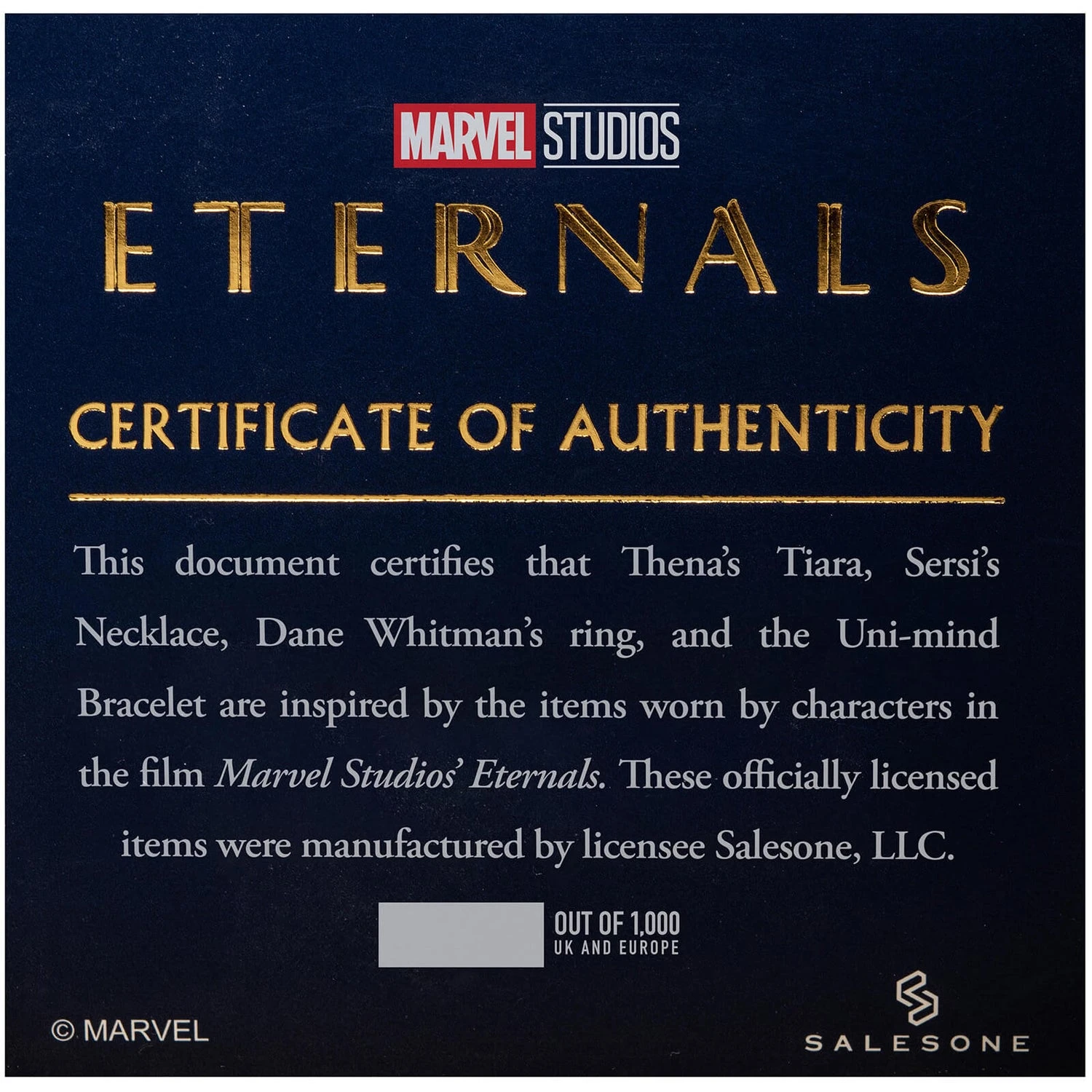 Each box contains an adjustable (size 9-12) Black Knight ring, Sersi’s Necklace (natural azurite on a 1.5mm * 18″+2″ chain with lobster clasp), an adjustable Thena’s Tiara, a 65 mm hinged Uni-mind Bracelet, and a certificate of authenticity.