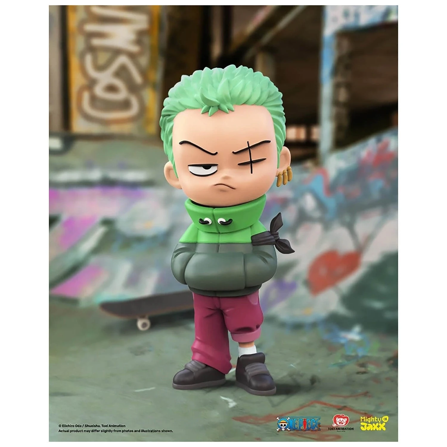 The unofficial vice-captain and first mate of the Straw Hat Pirates makes his CosmiQ x One Piece debut on Mighty Jaxx! Roronoa Zoro puts on a fit that complements his iconic green hair—a two-shade windbreaker and a loose pair of burgundy pants.
