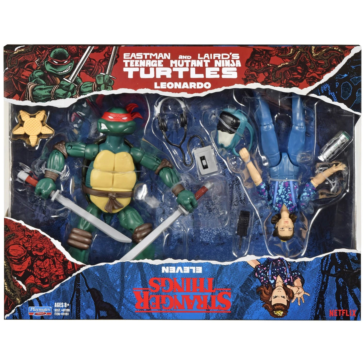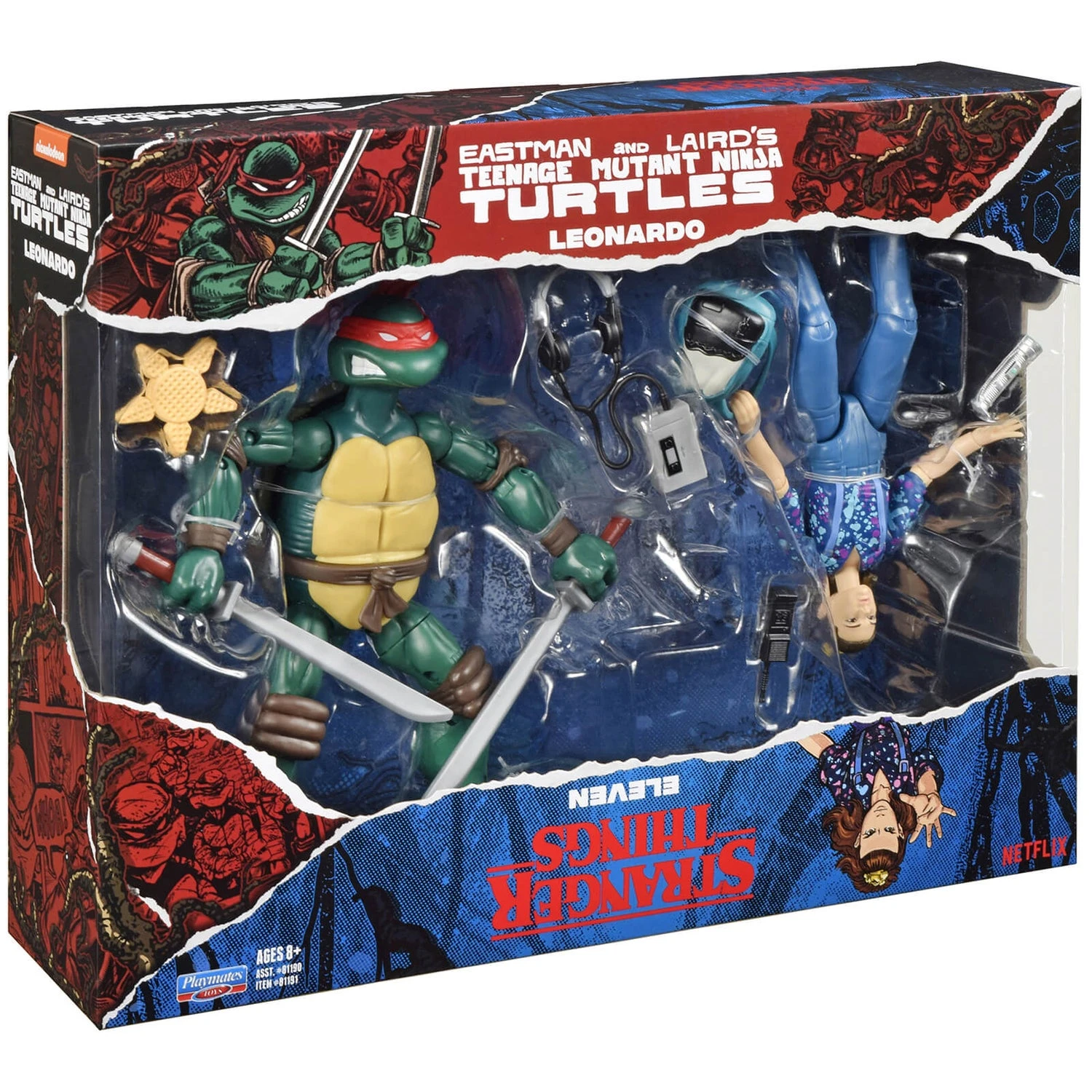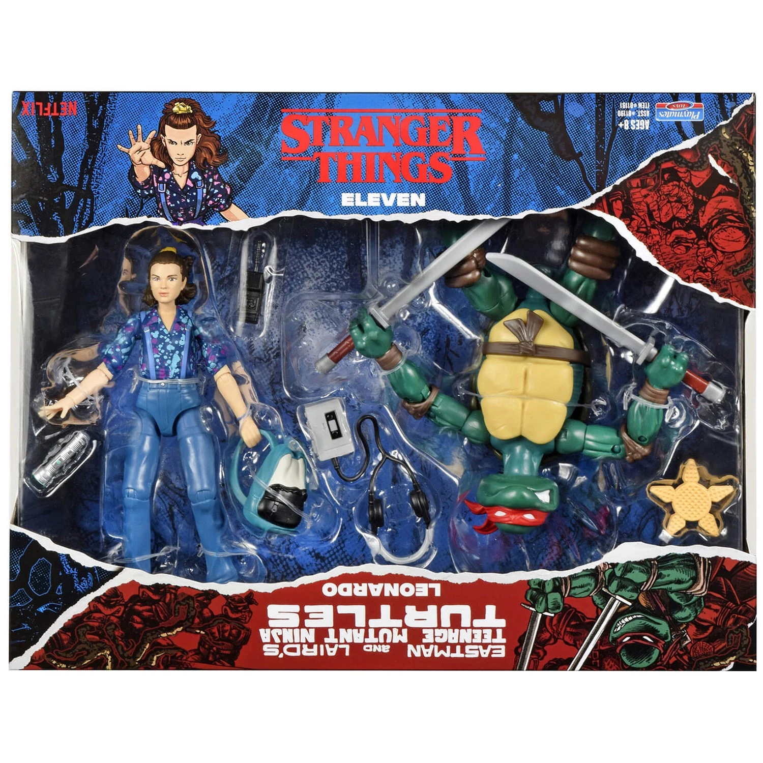 Leo is newly sculpted, based on his appearance in the 1984 comic book, with his red bandana, signature Katanas, waffle throwing stars, and a portable 1980s cassette tape player. Eleven dons her blue jeans with suspenders and a multicolour blouse from season 2, along with a backpack, flashlight, and a 1980s handheld phone. The figures come packaged in a highly collectible TMNT and Stranger Things co-branded window box.